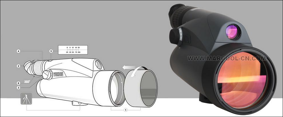 9, 为适应在恶劣环境要求下使用,本机可以不用取下产品包链接三却架使用。为减少炫光,可取下前物镜筒上的镜头罩倒置装在镜头前。
